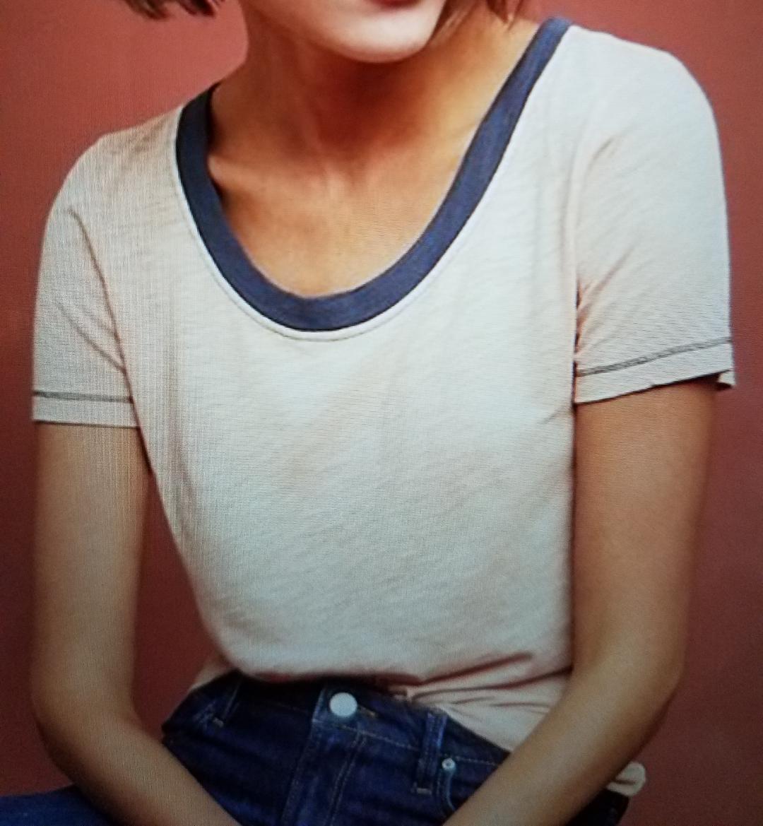 For myself, I was inspired by this (incredibly overpriced) tee from Anthropology. I liked the contrast neck binding and relaxed fit. Again, Sasha's tee with a strip of pink cut from the bright pink striped knit I used for Roo's Valentine Top and the last of my grey jersey, previously used for my Nikko and Melrose combo/separates, would be perfect!